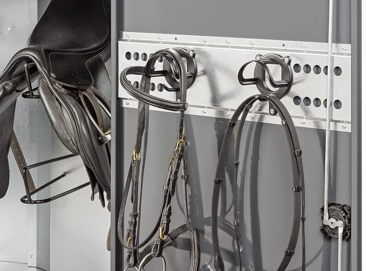 Sadelskabe i elforzinket stål med pulverlakerede døre. Udvendige kraftige håndtag