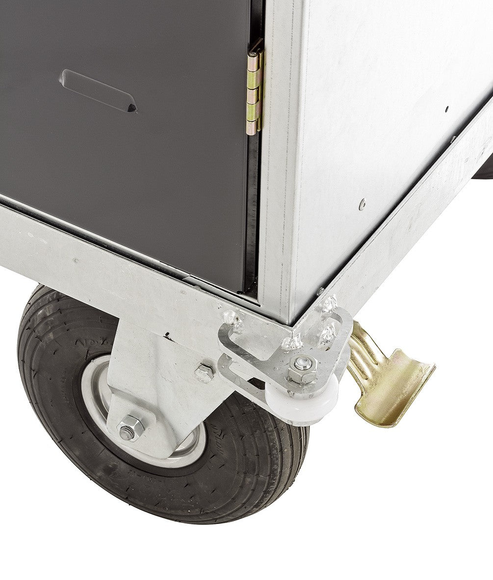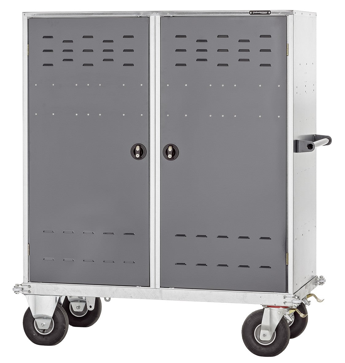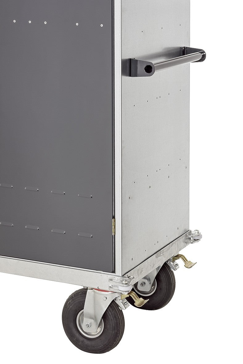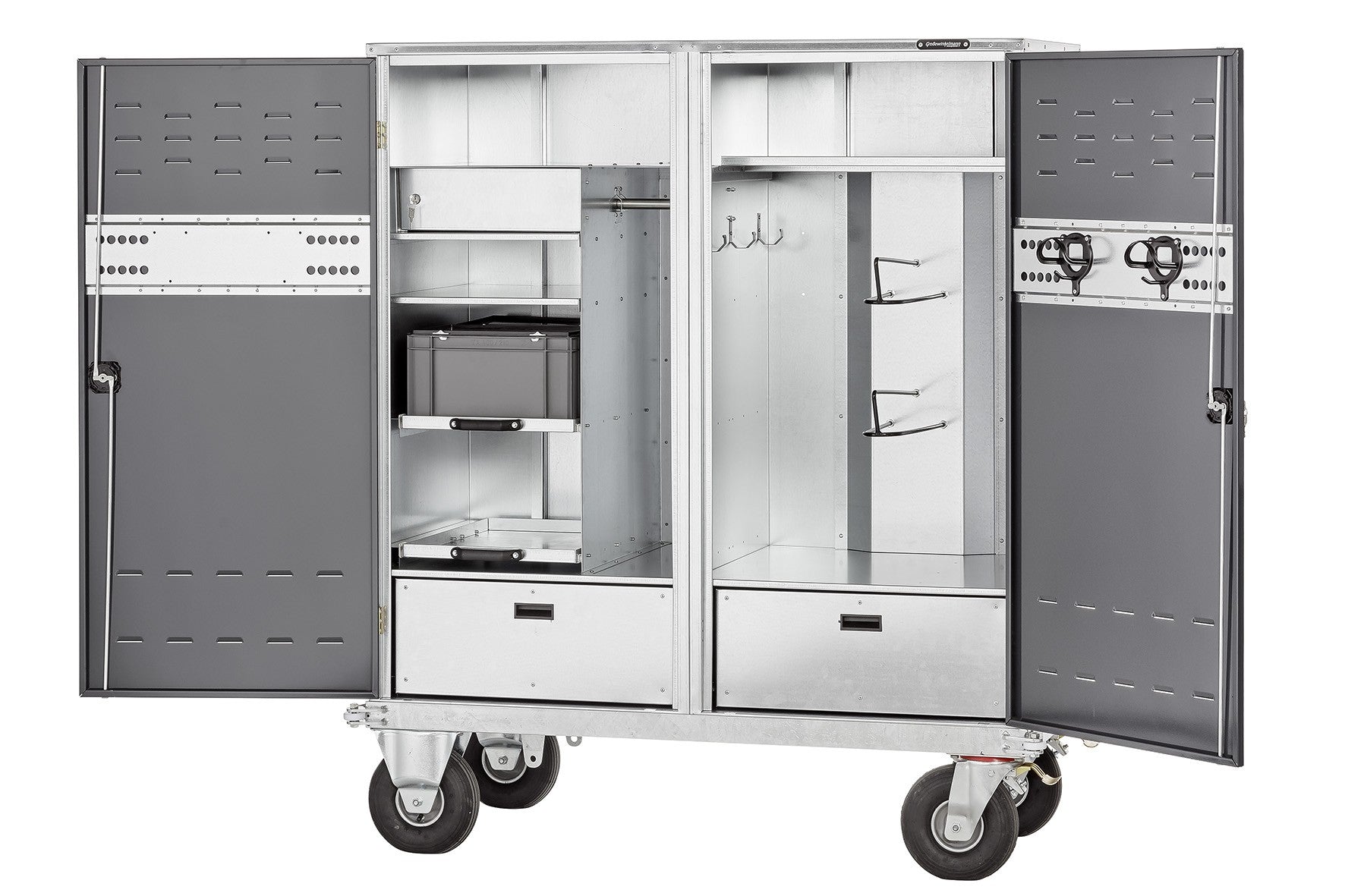 Sadelskabe i elforzinket stål med pulverlakerede døre. Udvendige kraftige håndtag