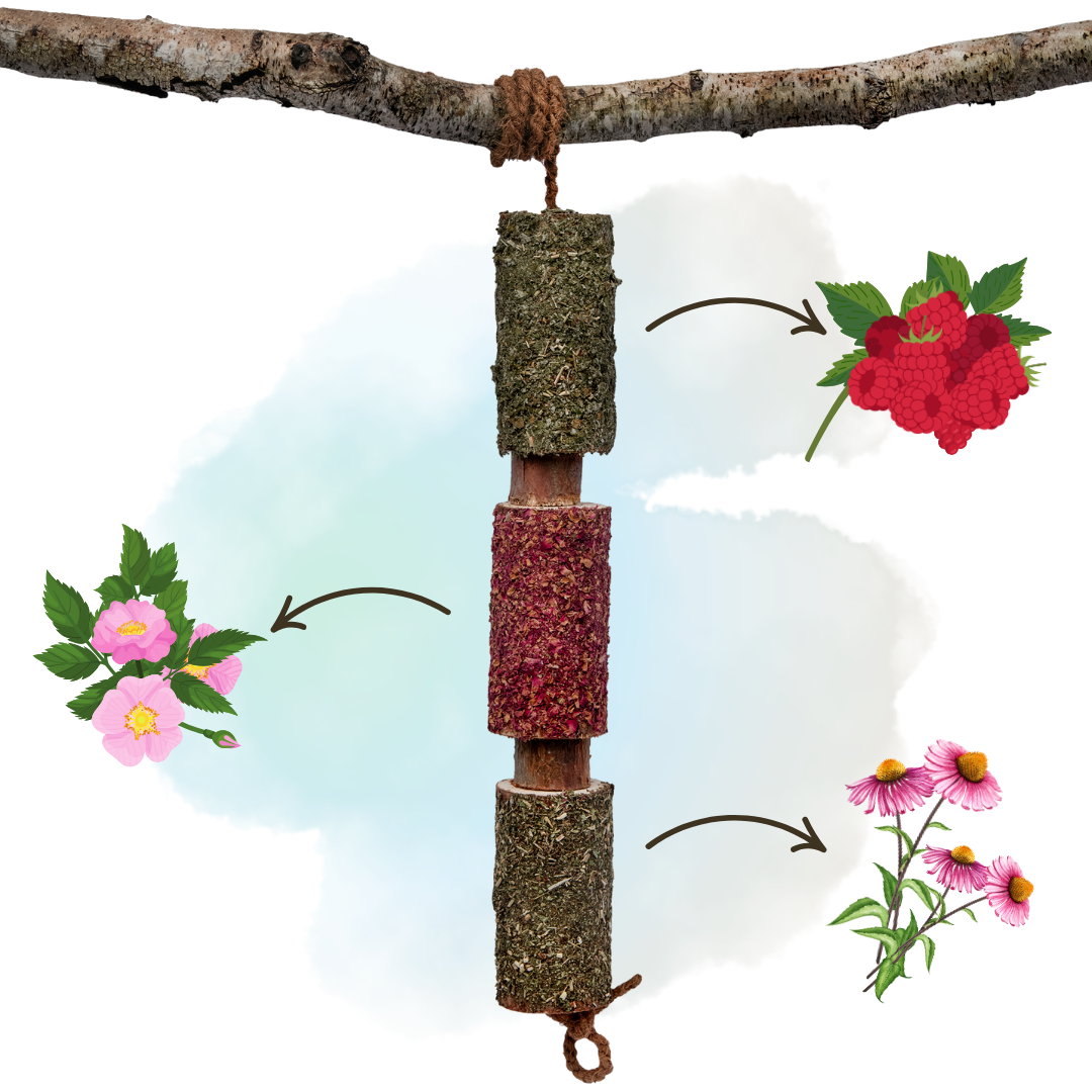 IMMUNITY Wooden Chewie I skovduftende urtetyggebid til immunforsvar er en vildtvoksende blanding af skovtræ, terapeutiske urter og æteriske olier - skabt til at vække din hests sanser og understøtte det naturlige immunforsvar. Hver birke- og fyrretræspind kommer direkte fra skoven, er ubehandlet, fuld af saft og dufter med kraftfulde botaniske ingredienser som vildrose, hindbærblad og echinacea.