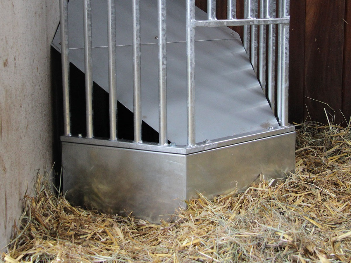 Denne sokkel er udviklet til at lukke mellemrummet mellem slowfeederen og gulvet, så hesten ikke kan få benene i klemme eller komme ind under foderenheden. Det øger sikkerheden markant og gør slowfeederen mere egnet til både stald og løsdrift.